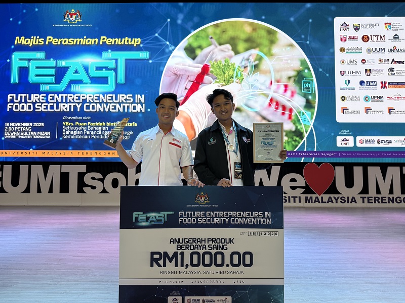 SERDANG, 24 November – Kumpulan CocoSplash dari Universiti Putra Malaysia (UPM) sekali lagi menyerlah apabila merangkul Anugerah Produk Berdaya Saing pada Future Entrepreneurs in Food Security Convention (FEAST25) baru-baru ini, sekali gus mengangkat inovasi makanan tropika negara ke tahap yang lebih tinggi.